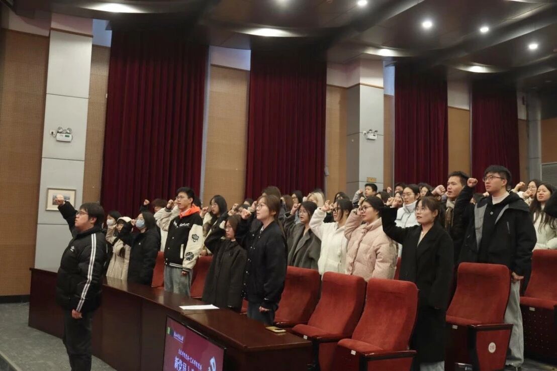 在新党员入党宣誓仪式上,艺术学院组织员汪一坤带领两学院69名新党员面向党旗庄严宣誓,铮铮誓言铿锵有力。新党员孙俊琪、尤悦同学分别交流发言,表达了对党的忠诚与为共产主义事业奋斗终身的决心。
