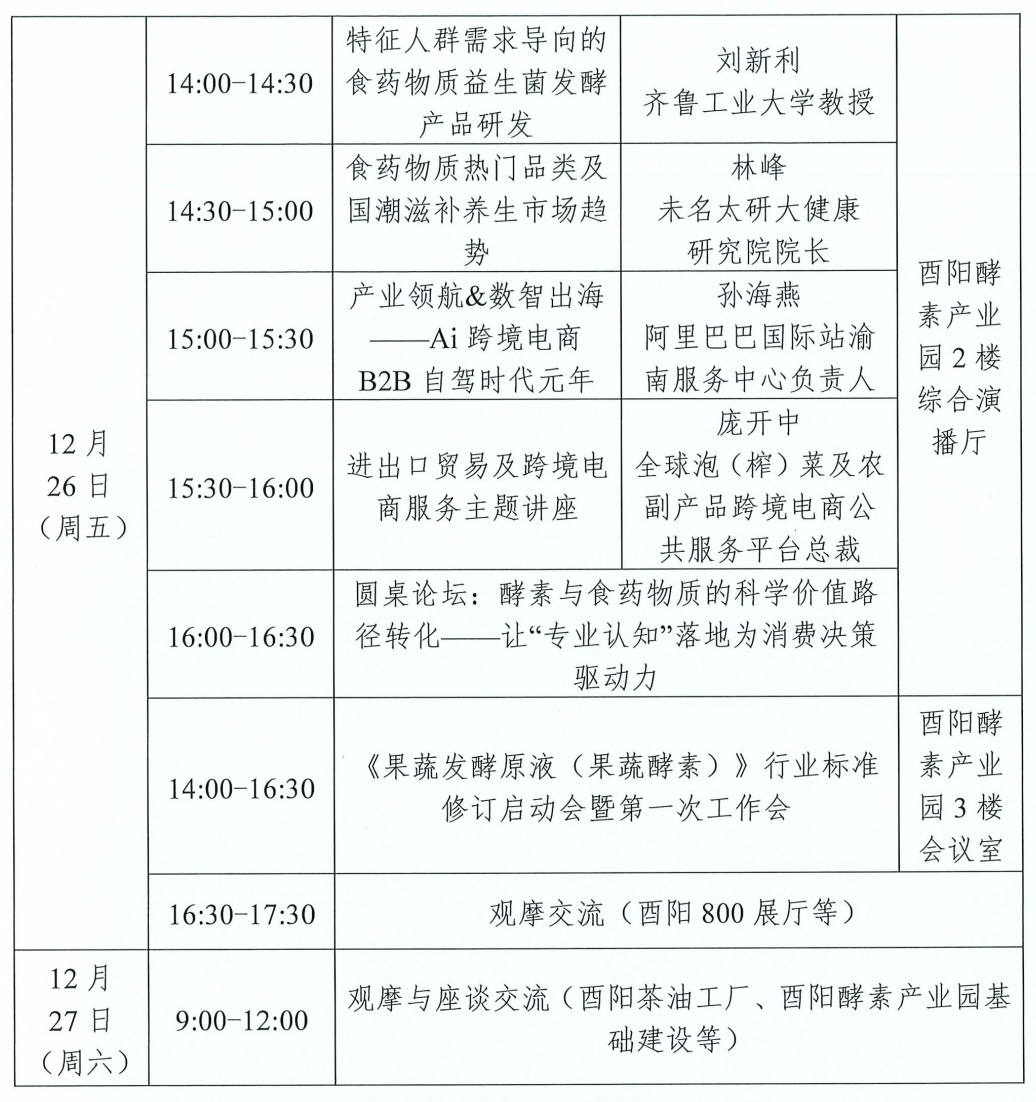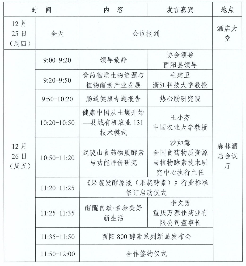 随着"健康中国2030"战略的深入推进和"十五五"规划建议对绿色低碳、乡村振兴的重点部署,酵素产业作为大健康与生态农业融合发展的战略性新兴产业,正迎来政策与市场的双重机遇。为更好地促进酵素行业发展,助力乡村产业振兴,中国生物发酵产业协会酵素分会定于2025年12月26-27日在重庆市酉阳县召开"2025第三届酵素产业发展大会(重庆酉阳)",同期召开"《果蔬发酵原液(果蔬酵素)》行业标准修订启动会暨第一次工作会"。具体事宜通知如下: