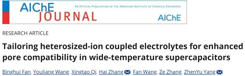 近日,365官网电化学储能材料与器件研究团队在化工领域权威期刊AIChE Journal上发表题为“Tailoring heterosized-ion coupled electrolytes for enhanced pore compatibility in wide-temperature supercapacitors”的研究论文(原文链接:https://aiche.onlinelibrary.wiley.com/doi/epdf/10.1002/aic.70266)。英国正版365官方网站为该论文的第一完成单位,化工硕士研究生樊炳辉为第一作者,青年教师张海博士与杨震宇教授为共同通讯作者。