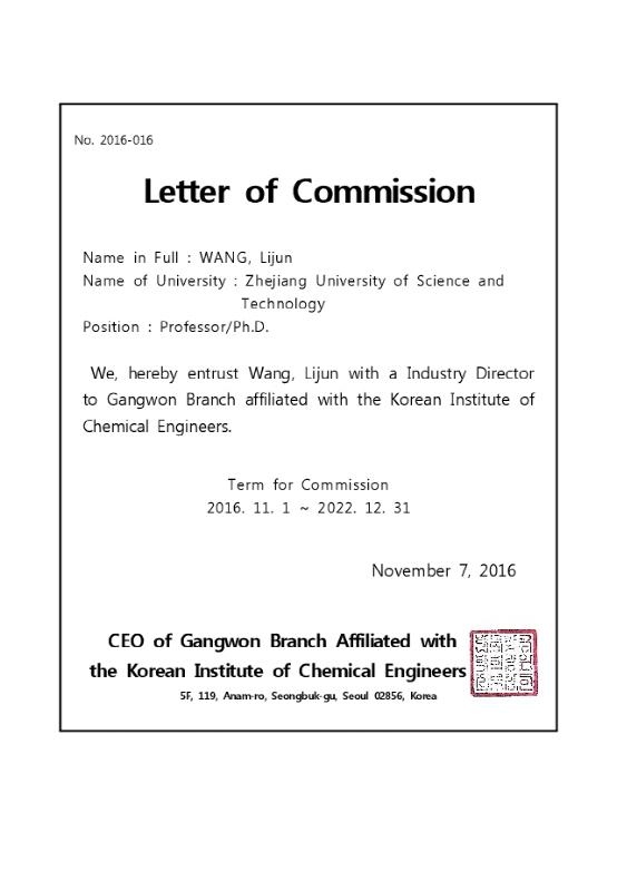 日前,我学院王立军教授被韩国化学工学会江原道分会聘任产学理事,任期五年。