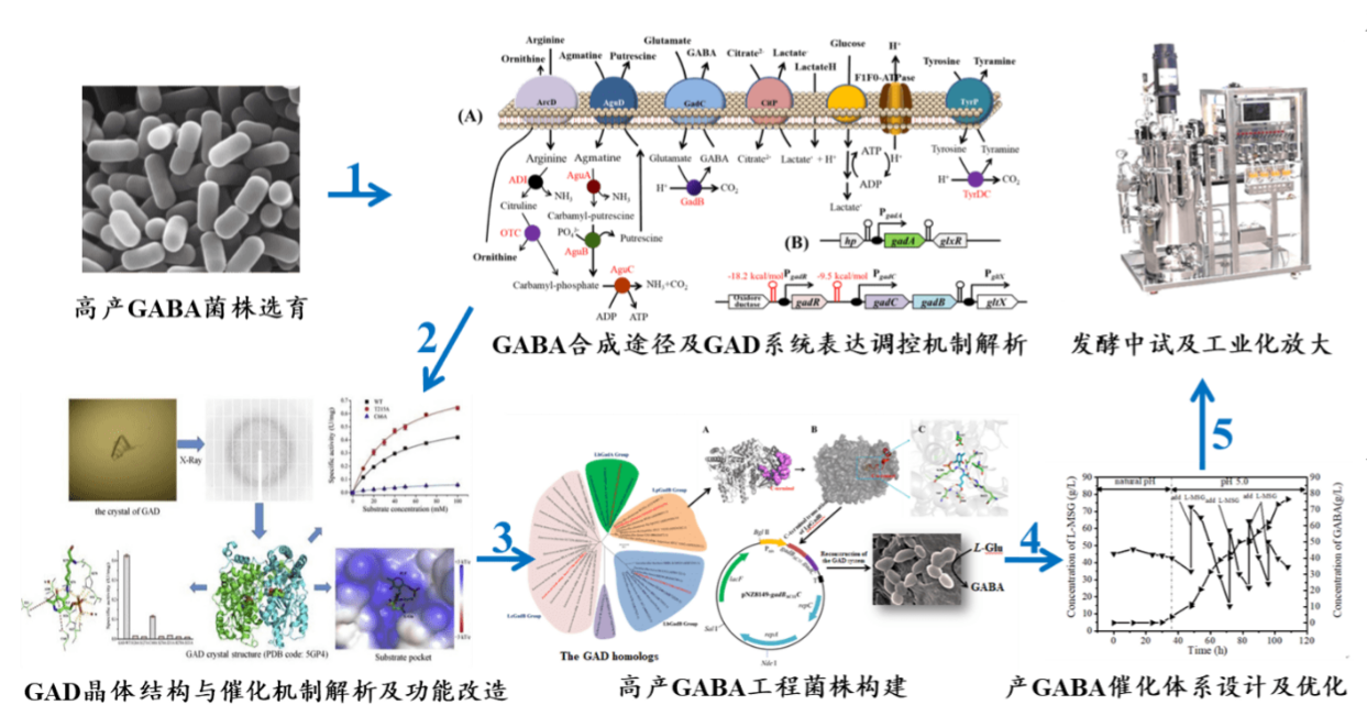 团队经过20余年的潜心研究,首次成功解析了乳酸菌谷氨酸脱羧酶的晶体结构(PDB:5GP4),攻克了生物催化法合成γ-氨基丁酸的关键技术难题与工程问题,突破了新酶创制、游离细胞催化反应体系优化与控制等系列关键技术。项目核心技术获得授权中国发明专利15项,在《Biotechnol. Bioeng.》《J. Agric. Food Chem.》等杂志发表学术论文39篇,构筑了具有自主知识产权的生产技术体系,成功实现了食品级、饲料级等不同级别γ-氨基丁酸产品的规模化生产,取得了显著的经济和社会效益。