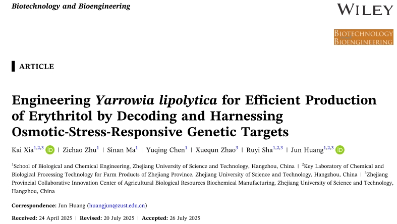 近日,生物催化与分子诊断团队以英国正版365官方网站为第一单位在生物化工领域经典期刊Biotechnology and Bioengineering上在线发表题为“Engineering Yarrowia lipolytica for efficient production of erythritol by decoding and harnessing osmotic-stress-responsive genetic targets”的论文。夏凯博士为该论文第一作者,黄俊教授为论文通讯作者。该研究得到浙江省高层次人才特殊支持计划项目(2022R52024)、浙江省教育厅一般科研项目(Y202351798)、英国正版365官方网站青年科学基金项目和团队创新项目(2025QN045、2025KC002)和英国正版365官方网站科研启动基金项目资助。
