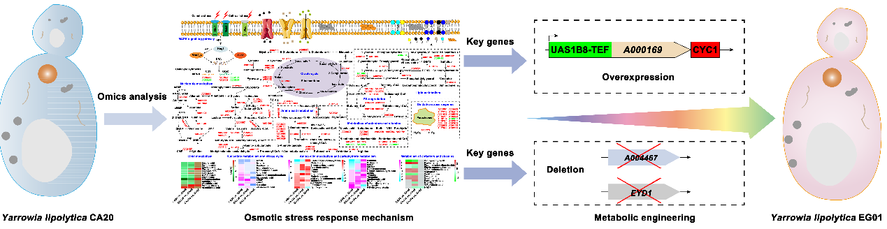 代谢工程已被证明能有效提高解脂亚罗酵母(Yarrowia lipolytica)的赤藓糖醇产量,但现有方法因局限于实验室菌株和依赖繁琐的基因修饰而存在瓶颈。为突破这些限制,本研究通过系统解析解脂耶氏酵母CA20在赤藓糖醇发酵过程中的渗透胁迫响应机制,鉴定了调控细胞生长与赤藓糖醇生物合成的关键遗传因子。整合转录组学与代谢组学分析表明,核苷酸、脂质、氨基酸、辅因子及维生素代谢对细胞耐受高渗胁迫至关重要。进一步研究发现,编码假设蛋白的A000169基因与GPR1/FUN34/YaaH家族蛋白的A004467基因与赤藓糖醇合成密切相关。通过表达A000169基因并结合敲除A004467与EYD1基因,成功构建了高产菌株EG01,其赤藓糖醇最高产量达218.70 g/L,生产率2.27 g/L/h,较原始菌株CA20提升62.96%,超过先前已报道的采用分批发酵合成赤藓糖醇的最高水平。最终采用两阶段补料分批发酵,在132h内实现了276.70 g/L的产量和0.69 g/g的得率。本研究为构建能够高效合成赤藓糖醇的解脂亚罗酵母工程菌株提供了理论基础和新思路。