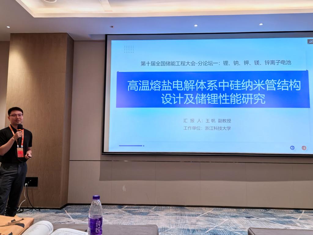 在“锂、钠、钾、镁、锌离子电池”分会场,王帆副教授报告了《高温熔盐电解体系中硅纳米管结构设计及储锂性能》的研究工作。该研究通过创新电极材料的制备工艺,实现了硅纳米管的可控合成,其优异的储锂性能为高容量锂离子电池的开发提供了重要参考。徐喜连博士则在同一分会场分享了《锌离子电池电极材料设计、制备及性能研究》的最新进展,其针对锌离子电池循环稳定性不足的问题提出的材料改性方案,为提升器件实用性迈出了关键一步。