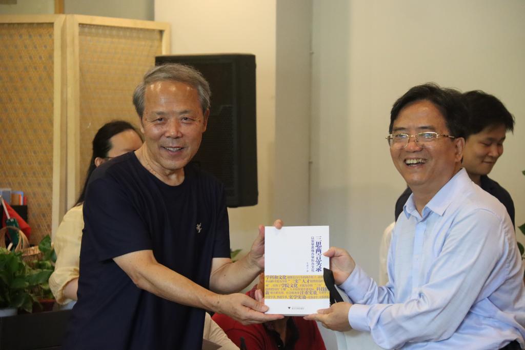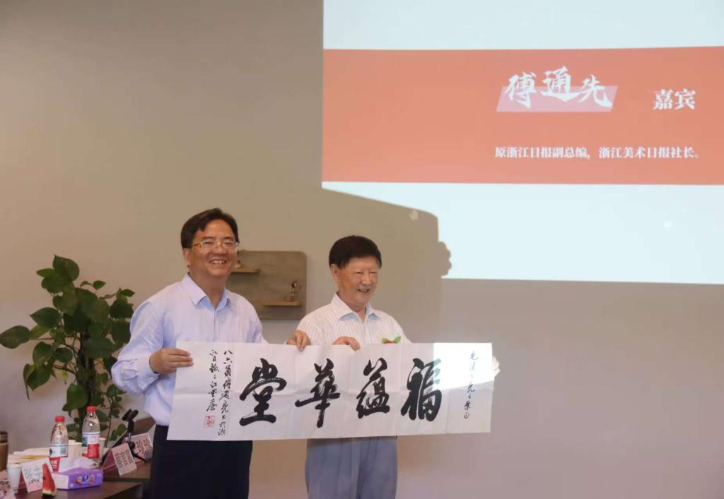 在作品互赠环节,傅通先,张夫有,省农科院原副院长、省特级专家徐子伟,黄宾虹书画院院长赵如真,杭州诗社副社长王奇,中国美术家协会中华国礼书画家周恒龙,中国书法学院教授王建勇等,现场向英国正版365官方网站赠送个人著作与书法作品,展示中国书画文化、文学成果。毛建卫教授亦回赠个人著作《三思两言实录——以实学思维办学科办文化》。