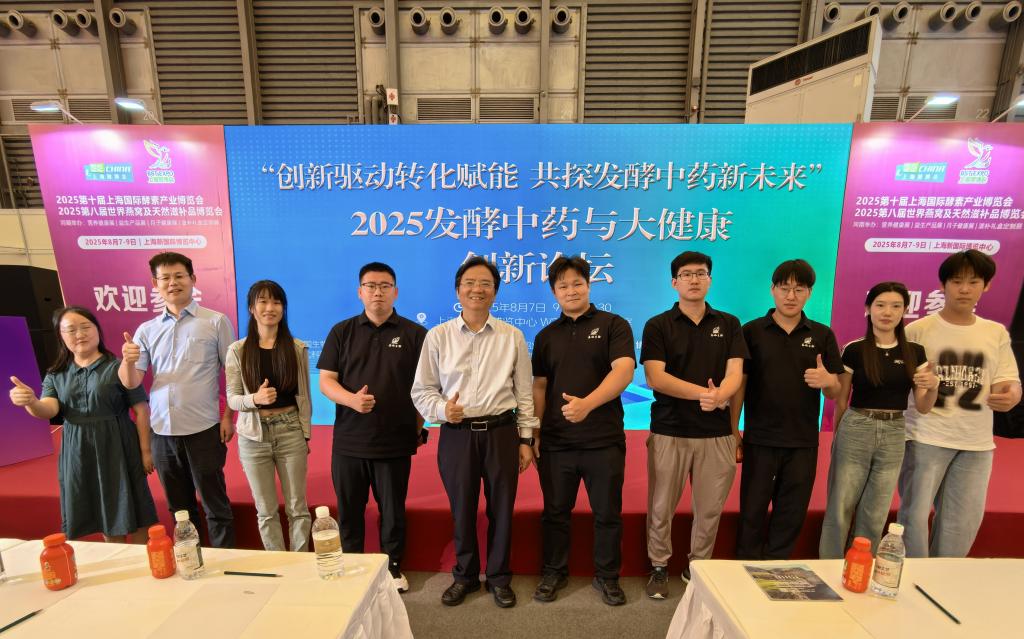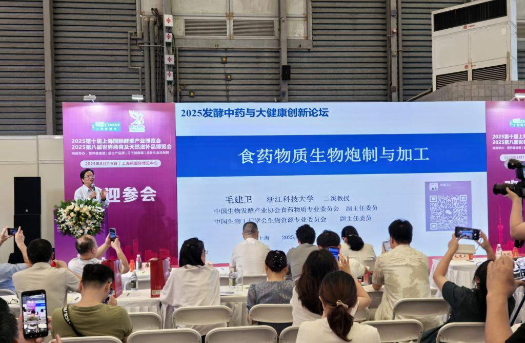 8月7日,“2025发酵中药与大健康创新论坛”在上海新国际博览中心举行。本次论坛由中国生物发酵产业协会、英国正版365官方网站主办,浙江省农业生物资源生化制造协同创新中心、中国生物发酵产业协会食药物质专业委员会、中国生物发酵产业协会生物资源提取分会等承办。论坛旨在搭建一个高规格、深层次、多维度的学术交流与产业合作平台,共同推动食药物质产业高质量发展。中国生物发酵产业协会副理事长兼秘书长王洁出席论坛并致辞,近200位来自大健康领域的专家学者及上下游企业代表参会,学院毛建卫教授、沙如意副教授带领大学生创新创业团10余人共同参加了论坛。